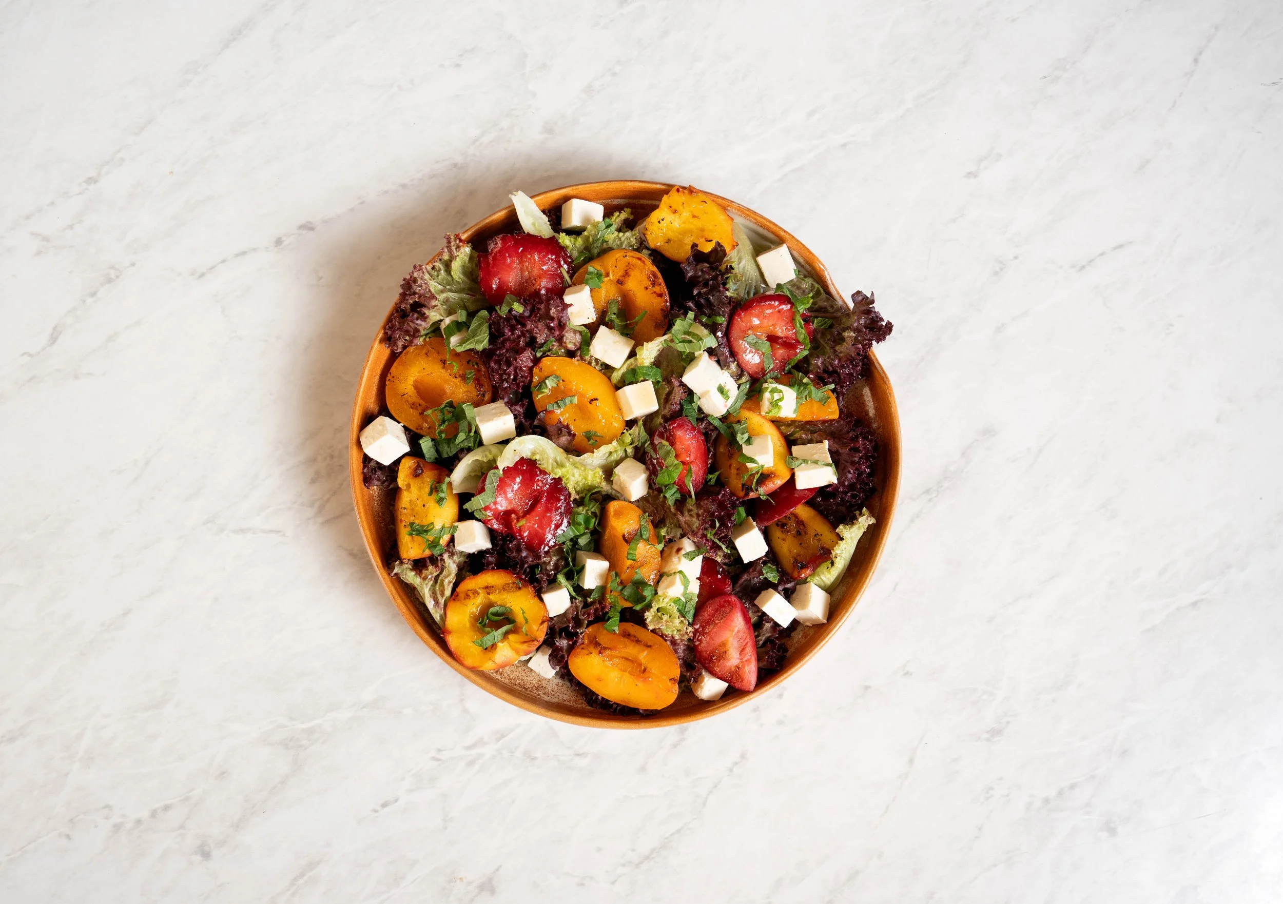 Assemble the salad: In a large serving bowl or platter, layer coral lettuce, stone fruit slices, herbs and crumbled feta. Grill the stone fruit for an extra layer of flavour!